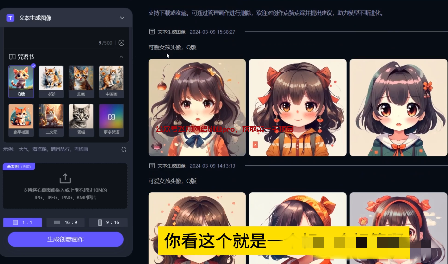 第二步我们用MG生成漫画人物素材,它的效果也是非常好,打开网站后,点击创意作画,这里需要一个关键词来搜索,比如搜索可爱女孩头像,点击Q版,生成创意画作,稍微等一分钟左右基本上全部就能生成出来,把自己需要的图片保存下来