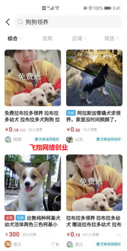 我们打开闲鱼去搜索“狗狗领养”,很多人在免费赠送各种狗狗,哈士奇,拉布拉多,阿拉斯加….