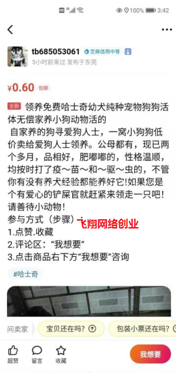 那么这个项目我们该如何操作呢?很简单,弄个闲鱼账号,复制同行的文案,图片,发布就可以了,这种产品一上去就有流量,加上详情页引导点赞转发评论,流量会涨的很快!记住,详情页一定要让客户点赞转发评论,只有这样才能爆发流量!篇幅有限,我这里就不教你们怎么注册账号,怎么发布了。