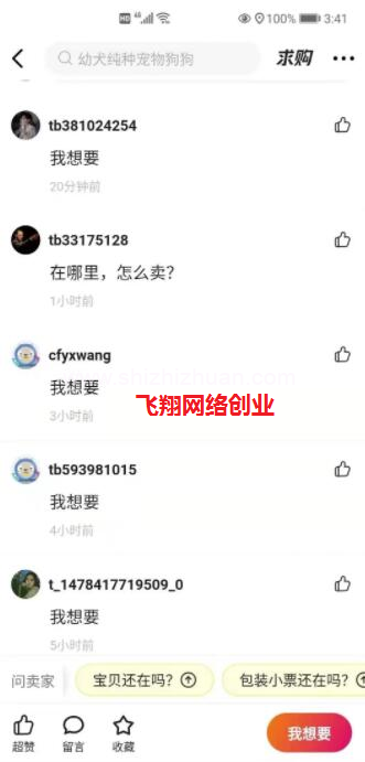 我们点进去看看,详情页写得非常真实,下面还有个参与方式:点赞,收藏,评论我想要,然后再咨询,看看下面每隔一两小时就有人评论,足以说明这个流量多大。 点赞收藏评论操作完之后,去咨询,卖家就该让你加微信了。