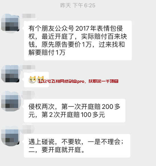 之前挺一位同行说,卖表情包,也是说侵权了,并且侵权了2次,要他赔偿1W,他直接让对方走法院流程,最后法院判了,侵权两次,第一次开庭赔200多元,第2次开庭赔100多元,总共赔了300多块