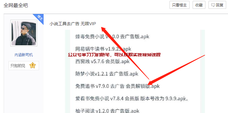 一般他们会去小说类的贴吧、社群等圈子发帖,免费分享一部分的小说资源,把喜欢看小说的人,引流到自己的私域上来,变现的话主要是卖软件或者小说章节,或者直接卖会员