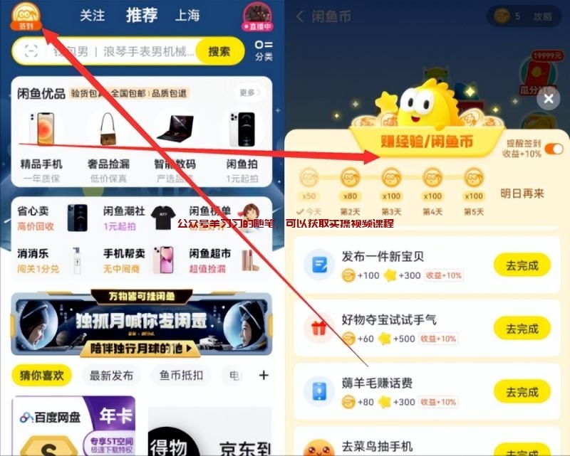 登陆闲鱼主页,左上角有个“签到”按钮,里面可以做任务领取金币。刚开始的时候,因为闲鱼的等级低,每天获取的闲鱼币也较少,后面每天会增加