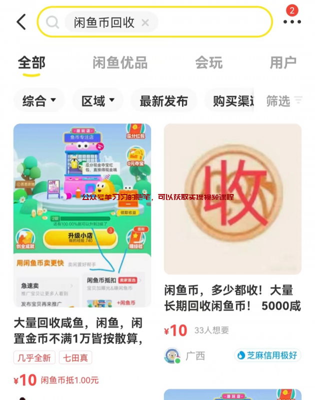 2、去闲鱼搜索“闲鱼币回收”,进行出售,闲鱼上有大量回收的人