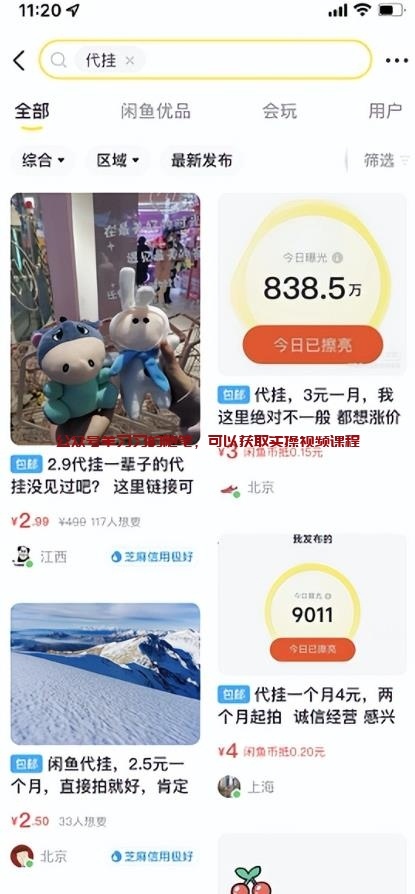 标题包含关键词如闲鱼代挂、每天擦亮、诚信可靠之类的