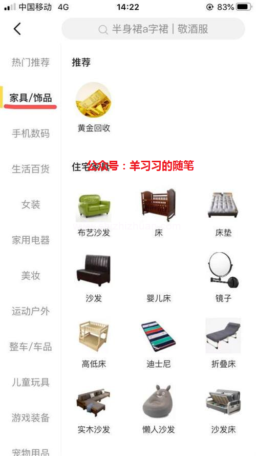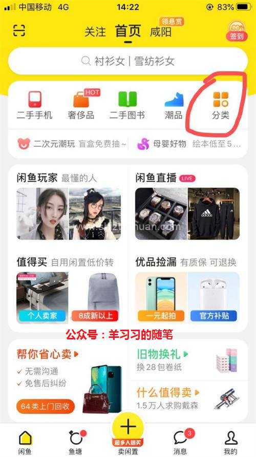 打开闲鱼首页,这里有一个分类,然后点击进去,就可以看到这里第二个图,分类,外加这个分类下有哪些品,当然这里显示部分,类目下还有其他好多品。而根据类目,验证下面的品,即可。