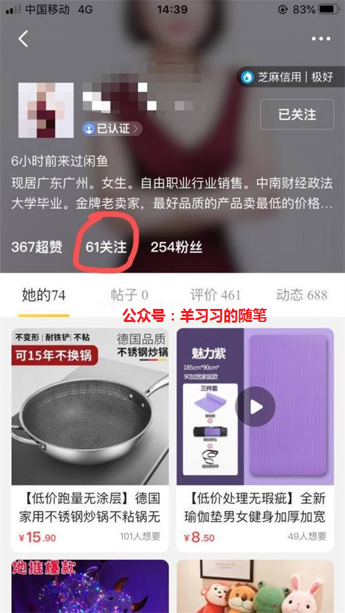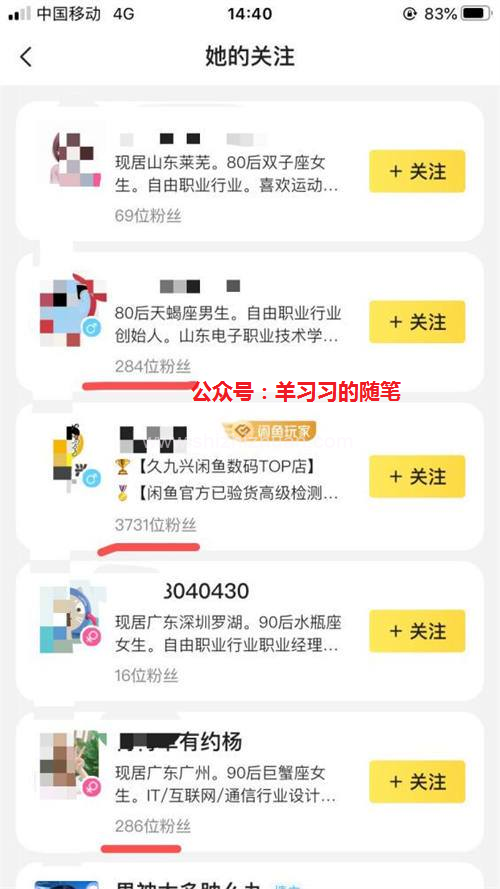 思路的延伸,总能发现很多无穷无尽好玩的东西,这个时候将人总会关注比自己厉害人的这个思路用到闲鱼这块,会发现同行会比自己厉害的同行。咱们咱们就去看他关注的同行卖那些好的品,而关注的同行还会关注其他人~~依次源源不断,源源不断,发现厉害的同行,发现厉害的品。
