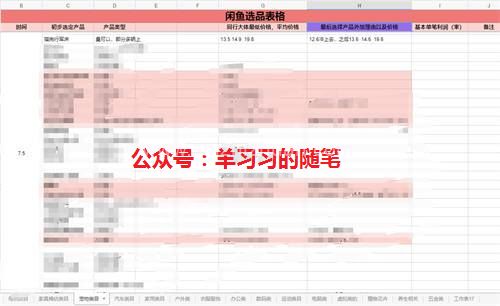 以上便是闲鱼店群这块的核心部分-选品。3种选品方法+核心验证思路,足够找到至少上万种不错的品。在选这些比较好的品的时候,总会记了这个,忘了另外一个。那么在这就可以借助闲鱼选品表格,将好的品按照类目进行汇总,建立属于自己的闲鱼选品库。如下图,自己建的一个选品库,平时看到一些不错的品,及时按照类目更新着,当做的时候直接上手操作即可,节省时间。