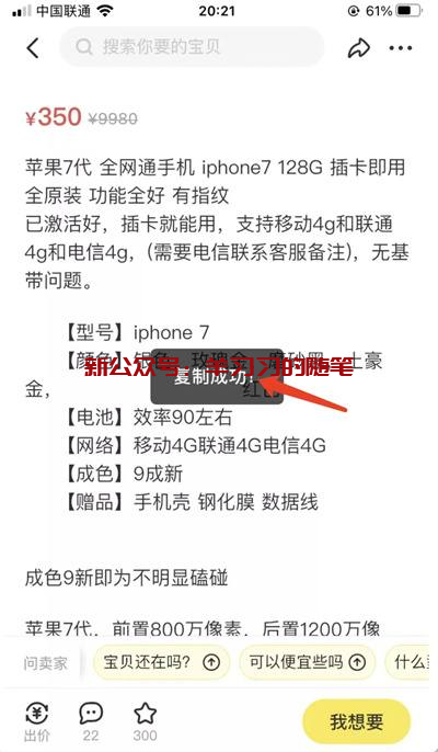 假设我们准备卖二手的苹果7,那就直接在闲鱼上搜索苹果7(iPhone 7)这样的关键词,然后再搜索结果中,找“想要”数比较大的那一类宝贝,长按宝贝的描述,就能直接复制这个文案,你的文案不要完全照搬,可以建立在复制的文案基础上做一定程度的调整。