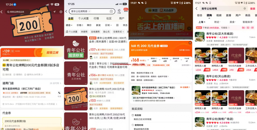 还有今日热销第二位的,青年公社烤鸭200元代金券