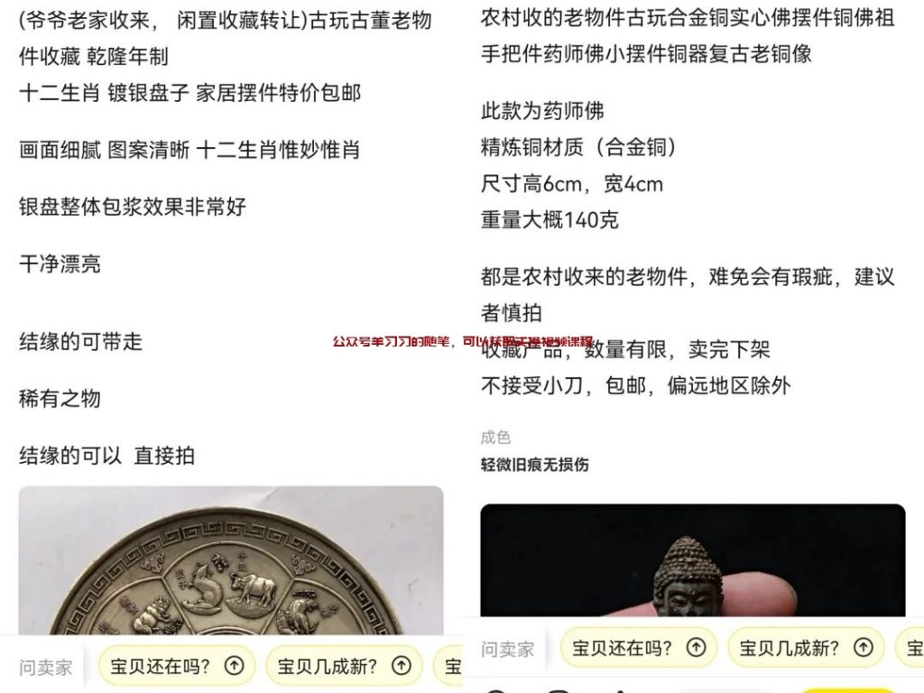 做这类产品的话,文案我们可以直接参考同行的,比如像是爷爷从古玩市场淘到的字画,不知道真假,低价出售爷爷淘来的古玩,或者准备搬家了低价出售等等之类的,文案注意,千万不要去承诺这东西的真假,因为我们也不是专业的鉴定师,没法判断真假,对于一些问题太多的买家,就不要卖给他们了,另外如果多多拿货的话,一定要选择有运费险的商家,如果说有客户要求退货就可以直接退货,避免引起纠纷。