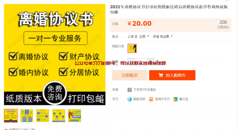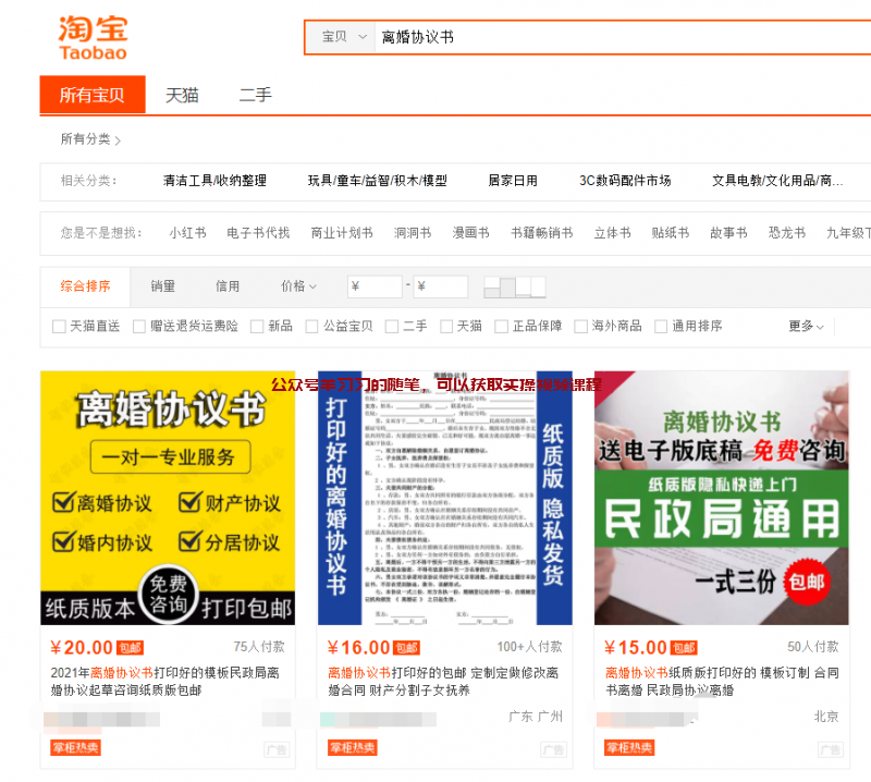其实在淘宝上面搜一下这个离婚协议书,虽然有人开车,但是做的人还是属于少数的,一搜发现很少人去做,一般一份离婚协议书文档的价格都有几十元,月销量很多也都几百上千的,如果涉及到特别定制的协议,价格会更高
