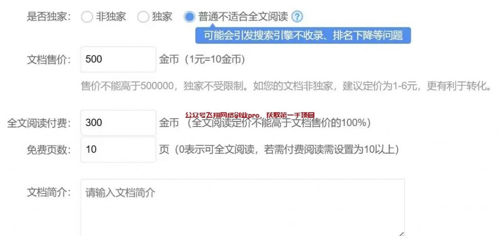 每次上传文档的时候,底部都可以这样设置,像我就选【普通不适合全文阅读】,文档售价是500金币,全文付费阅读300金币,免费页数建议设置5-10页,可以大概让别人预览下,有助于下载。