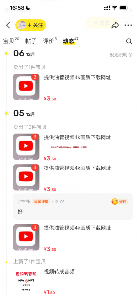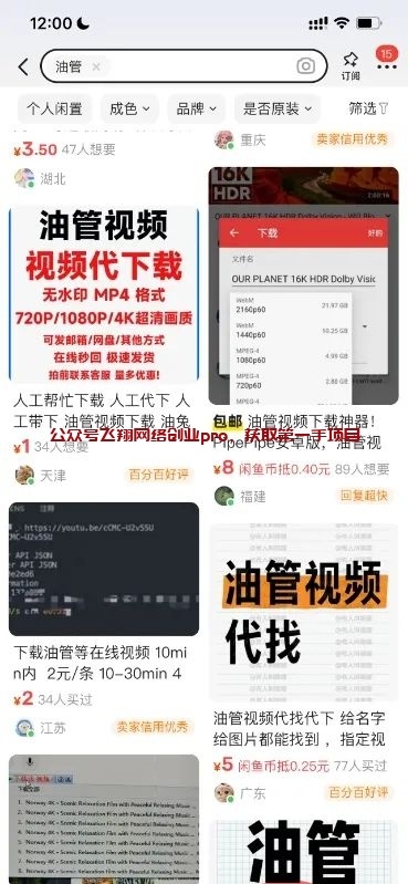 重点可以布局油管、视频号平台上的视频内容下载,这两个平台视频下载是有门槛的,比较适合放在闲鱼上做。