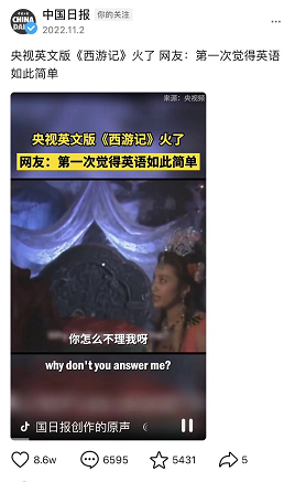 大家好,我是飞翔,不知道你们有没有听过英文版的西游记,曾经央视就专门为西游记出过一个英语版的,只是关注的人的很少很少,但是前段时间,英语版的西游记又火起来了,估计很多小伙伴都刷到过这些视频,我第一次看到的时候就觉得很新奇,特别有意思