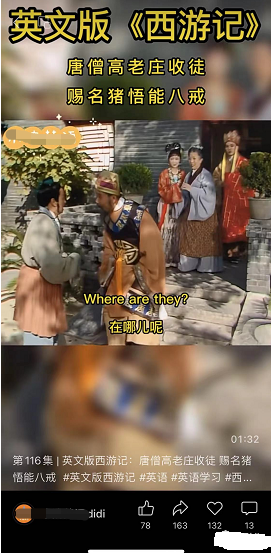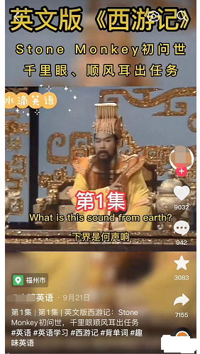 做这种视频其实很简单,找到合适的片源并下载后,用剪映剪辑成很多片段在抖音、快手、视频号这些短视频平台发布,尤其是视频号目前优质的内容很少,相信这个年代每个人都看过西游记,这种自带内容和流量并且还是英语版的西游记肯定受欢迎