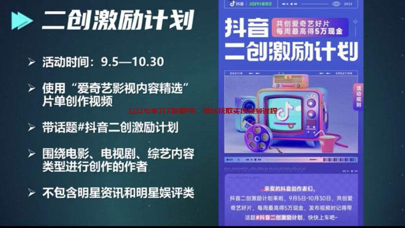 这次的计划一直持续到10月30号,只要用了爱奇艺影视内容精选的片单进行创作视频,而且在抖音发布视频的时候添加上“抖音二创激励计划”的话题标签,就可以参与到抖音的二创激励计划