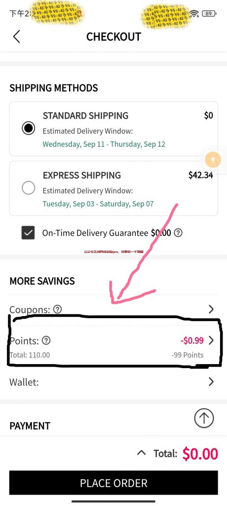 地址填完后,进入到付款的界面,这里特别注意一下,下图points这里,选中系统送我们的点数