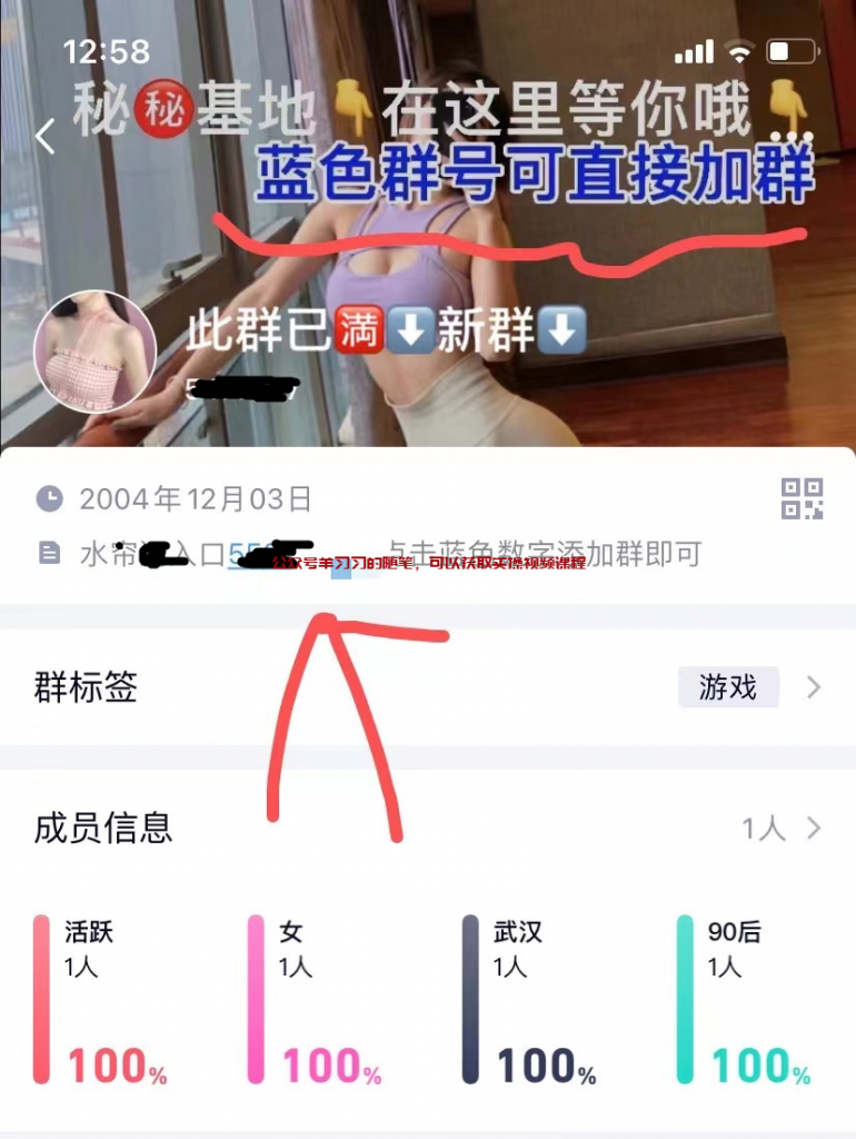 因为他这种类型的群,是非常容易被封的,为了不丢失抖音上引来的流量,他采取了上面的那种方法引导到第二个群,这样即使后面的群被封了,他也可以第一时间把流量导入到新群里,只需要更改一下第一个群的简介即可