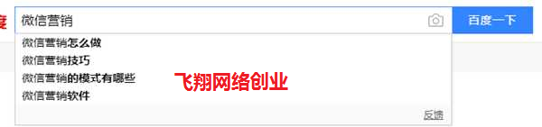 如图所示在百度的搜索框中输入微信营销,下拉框会自动的弹出4个相关关键词,这4个关键词就是近期内(大概是3-7天)搜索频率高的关键词。
